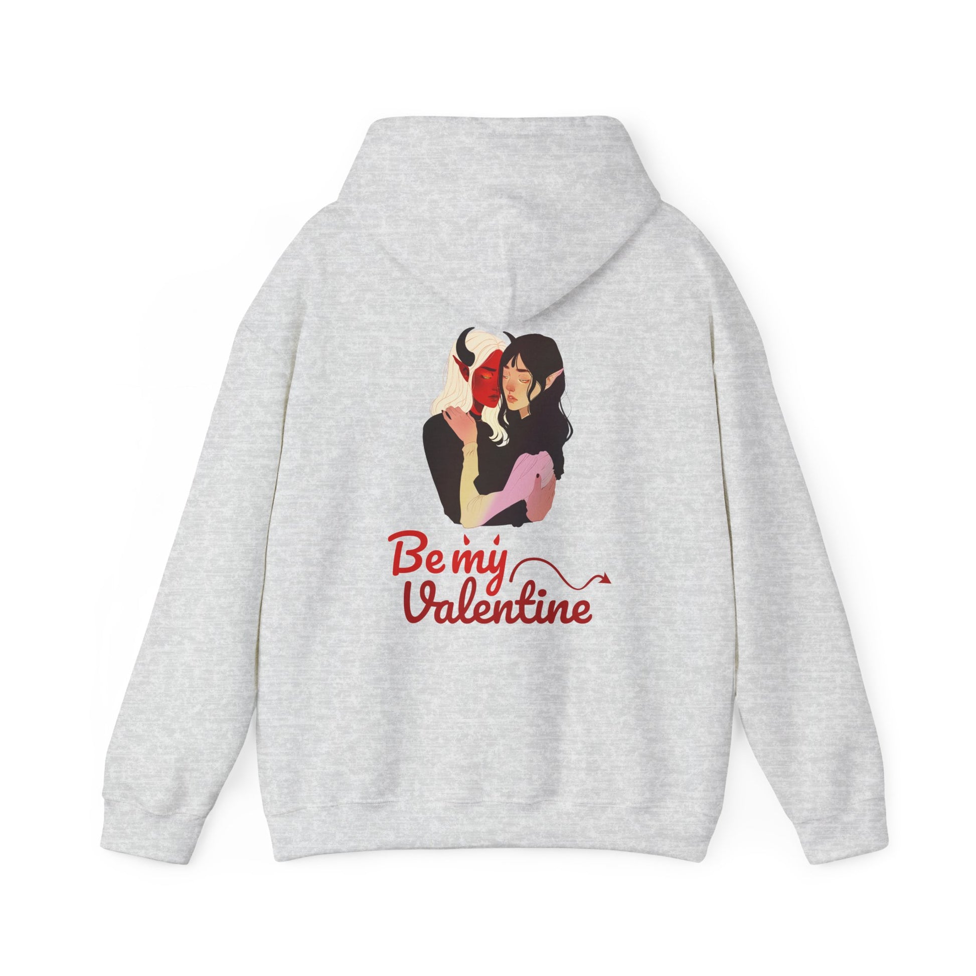 Celebrate love with a touch of fantasy in the 'Be My Valentine Hoodie.' This cozy white hoodie features a charming illustration of two mythical lovers: a red imp and an elf, capturing the essence of romantic diversity and magic. Perfect for Valentine's Day or to express your unique style, this hoodie combines warmth, comfort, and a bold statement of inclusive love. Made with sustainable and high-quality materials, it’s the perfect gift or an ideal addition to your wardrobe. Say it loud, 'Be My Valentine!'