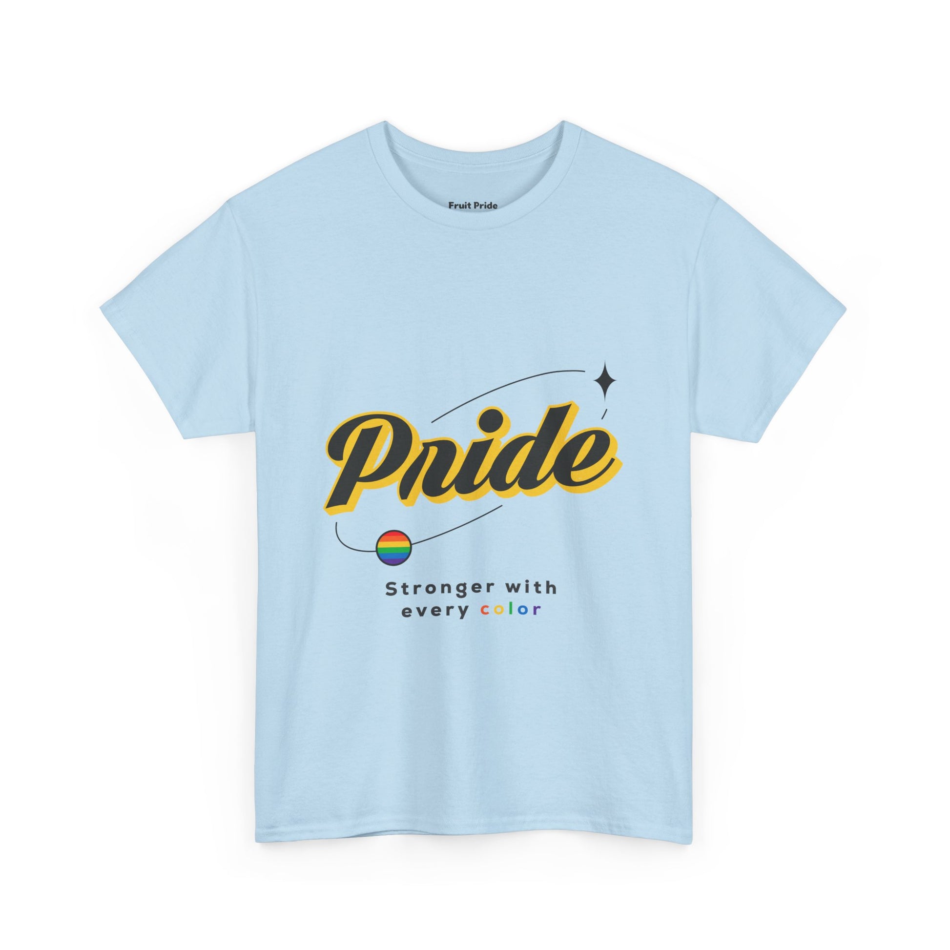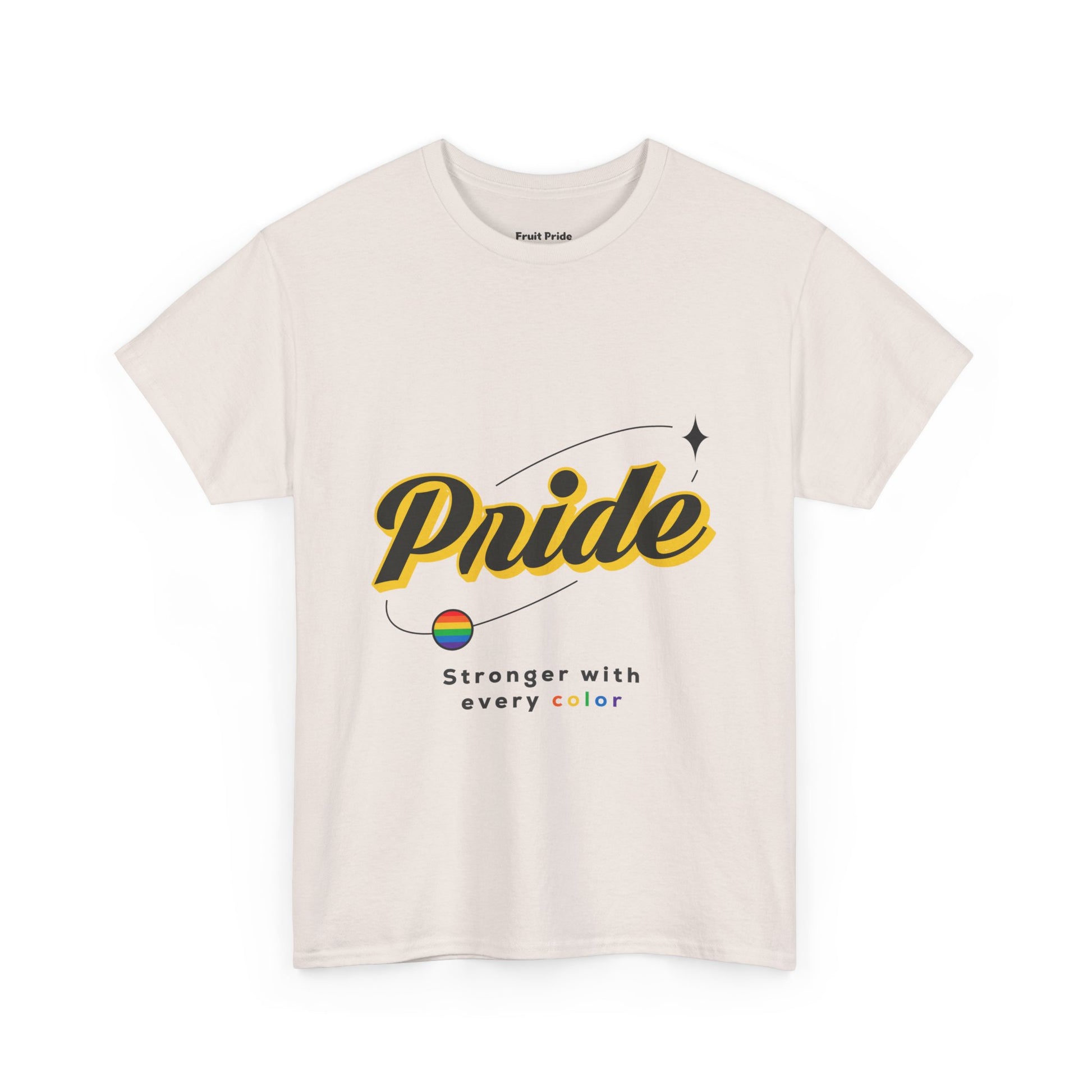 Loud, proud, and glowing with unity. This pastel pink tee is a visual love letter to every shade of queerness. With a radiant “Pride” in golden yellow and a small rainbow flag orbiting the phrase “Stronger with every color”, it reminds us that every identity adds power to the pride we share.