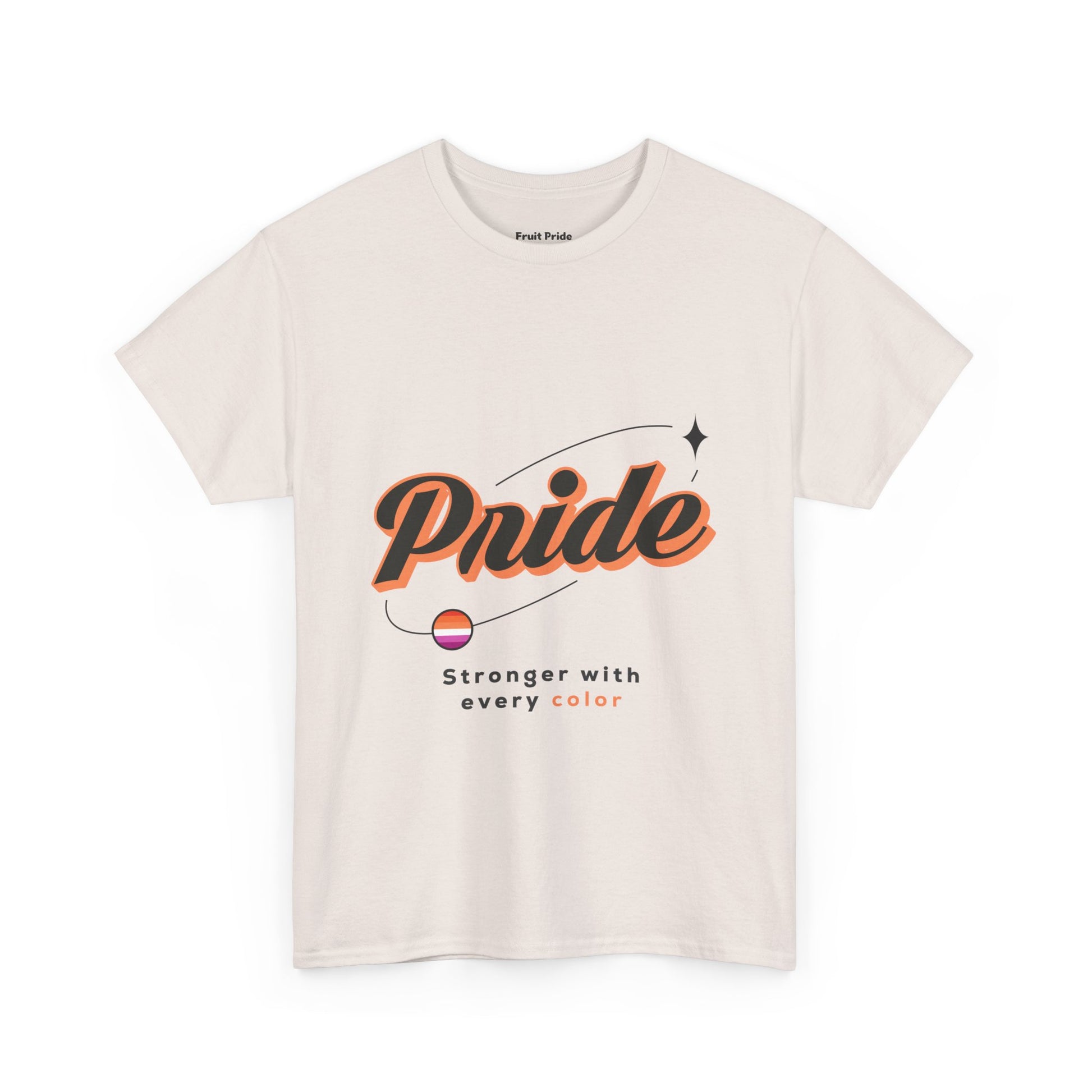 Bold, beautiful, and undeniably lesbian. This powerful design features a warm orange Pride script with the lesbian flag gracefully orbiting the message “Stronger with every color.” A tribute to love between women, sapphic power, and all the shades of identity that make Pride truly complete.