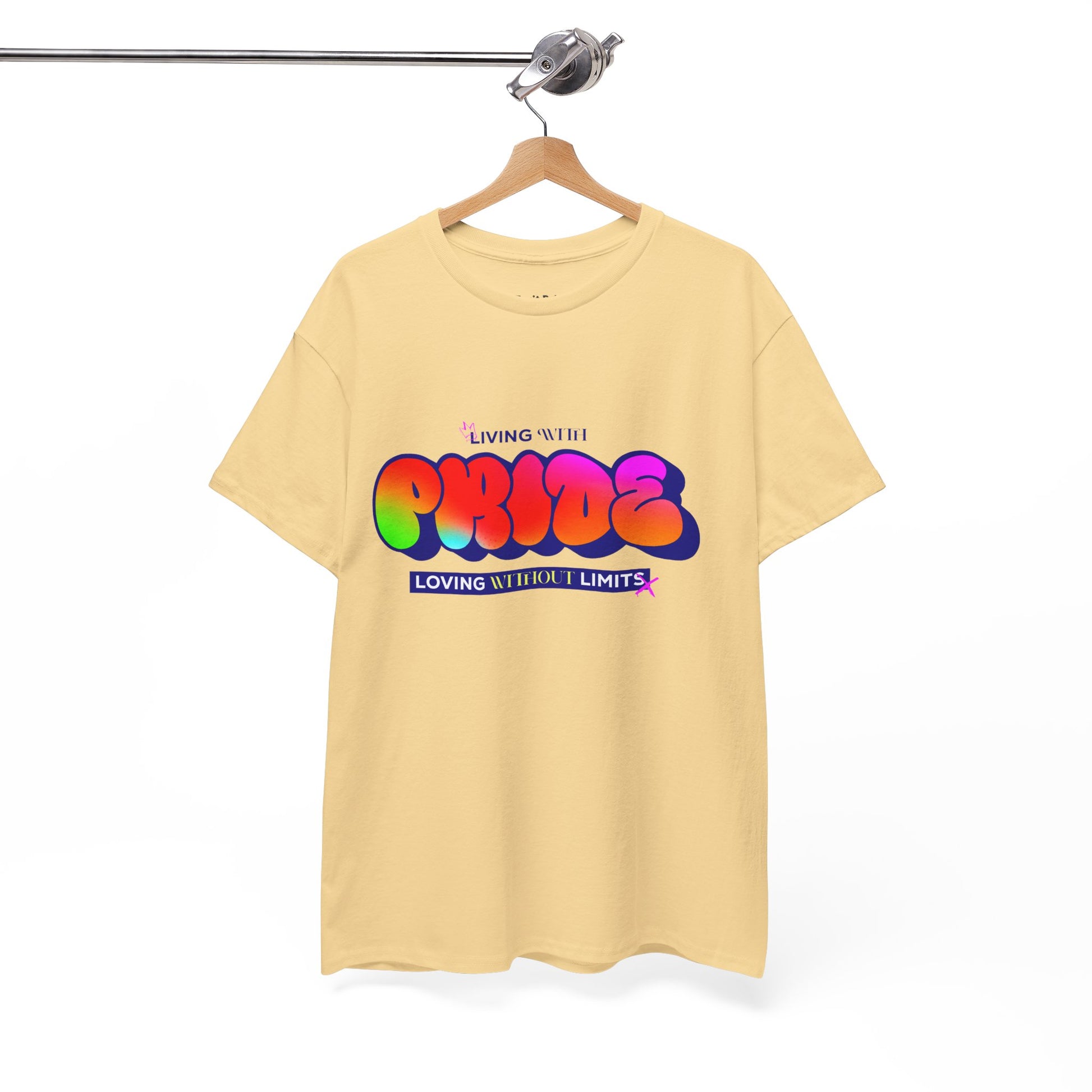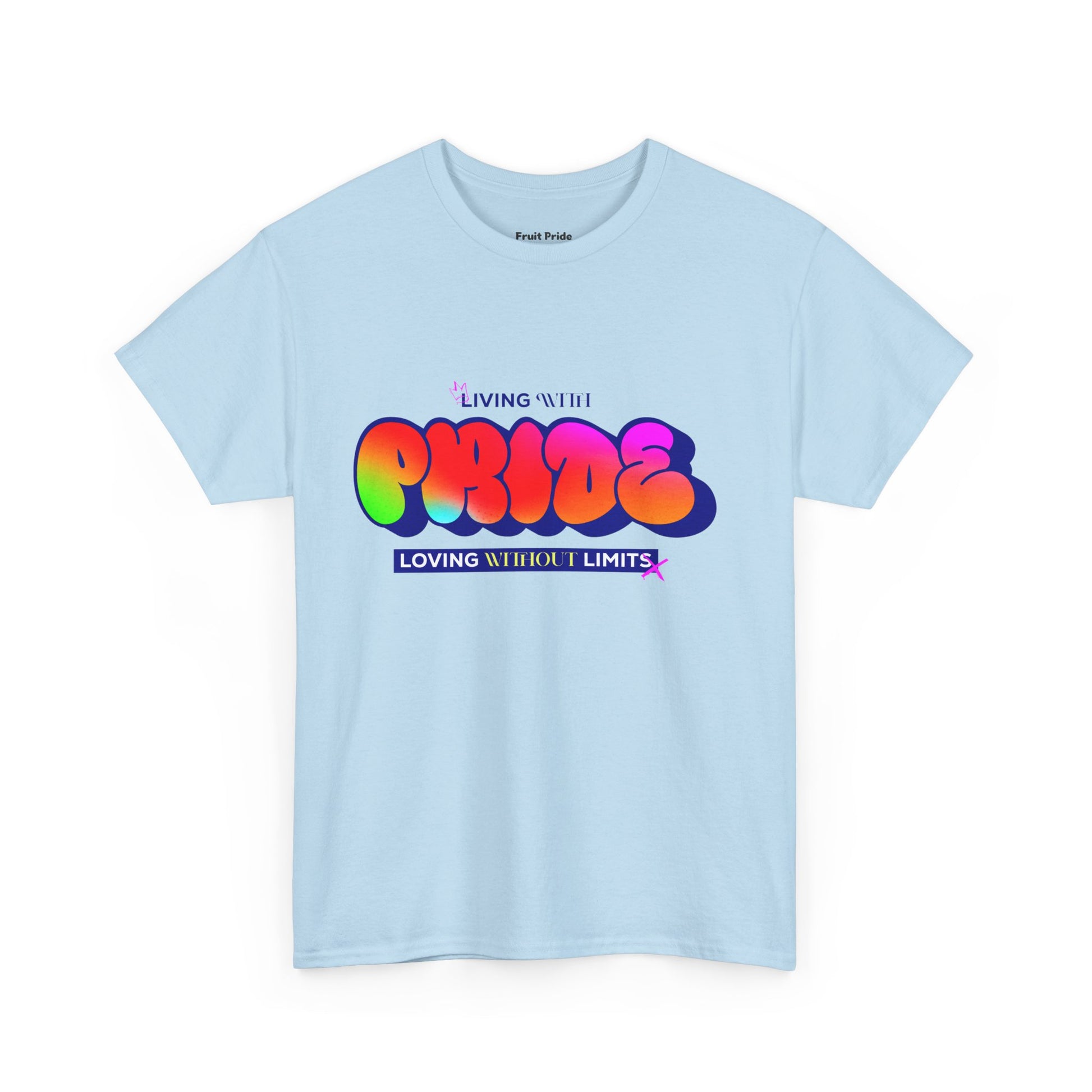 Turn up the color, turn off the shame. This tee is a full-spectrum celebration of queer joy, featuring bubbly rainbow letters and the bold message: Living With Pride, Loving Without Limits. Perfect for parades, protests, or just your fabulous Tuesday.