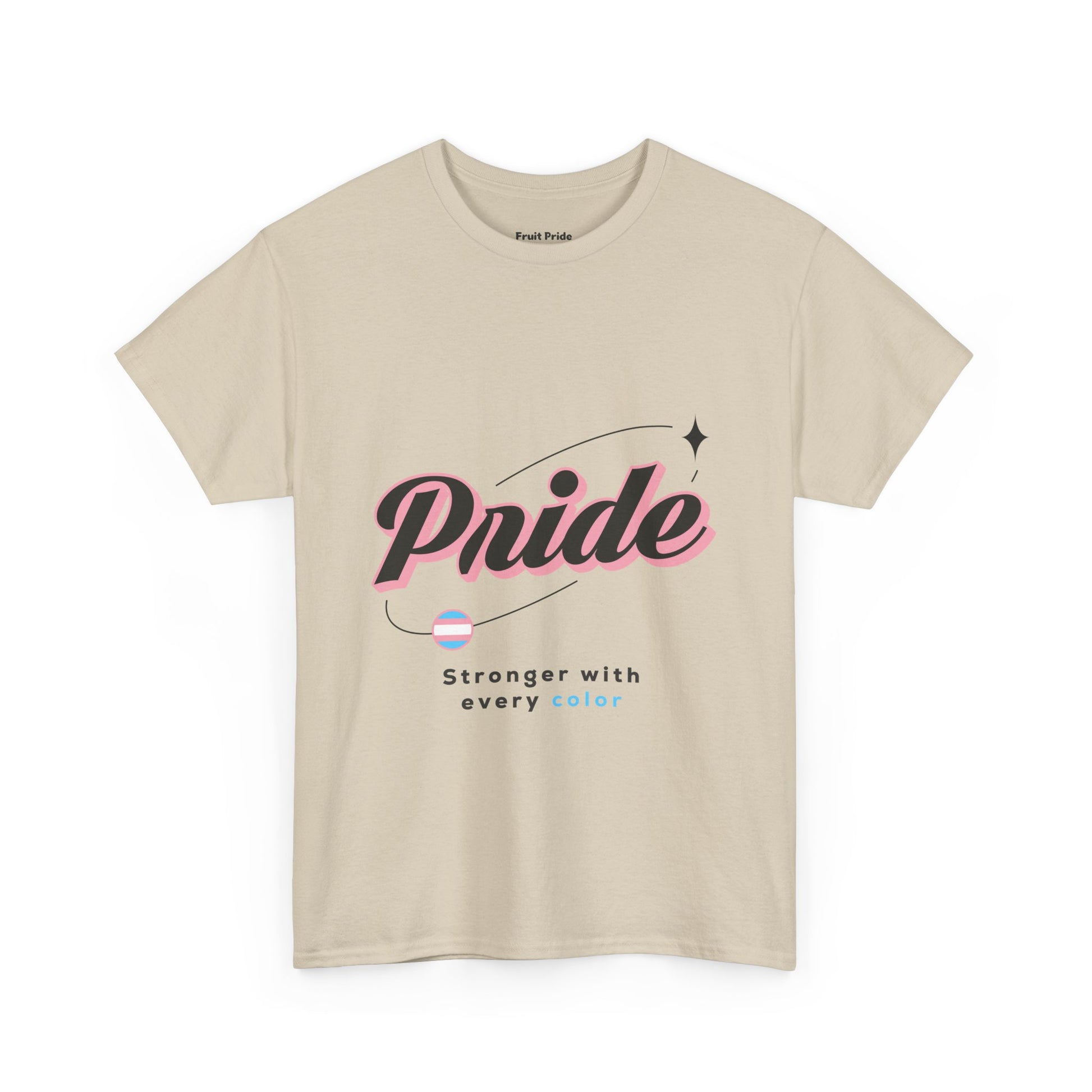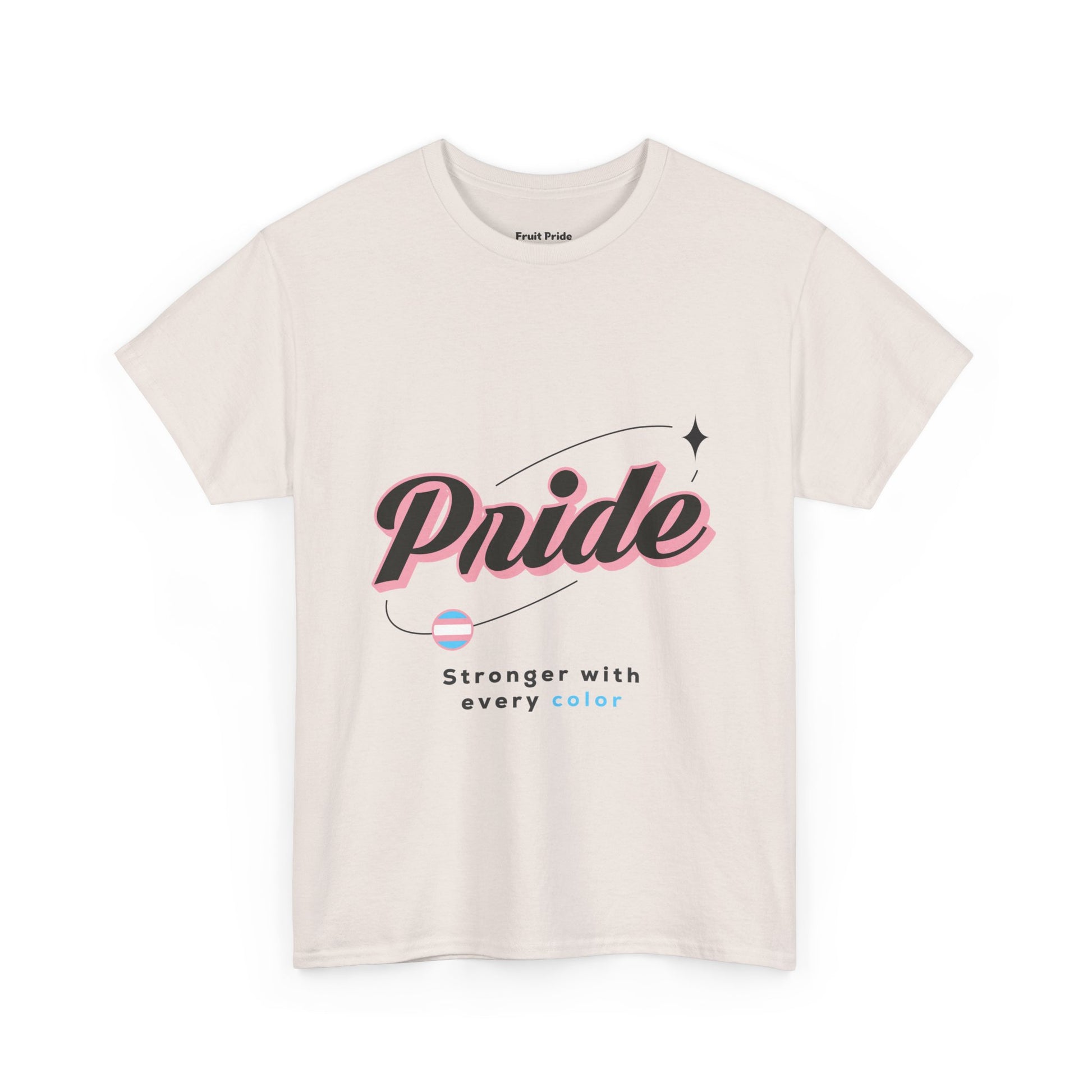 Soft but radical. This pastel pink tee reminds us that Pride gets stronger with every letter, flag, and heartbeat added to the rainbow. With a sleek script Pride, a trans flag accent, and the phrase “Stronger with every color”, this design honors unity in every shade of love and identity.